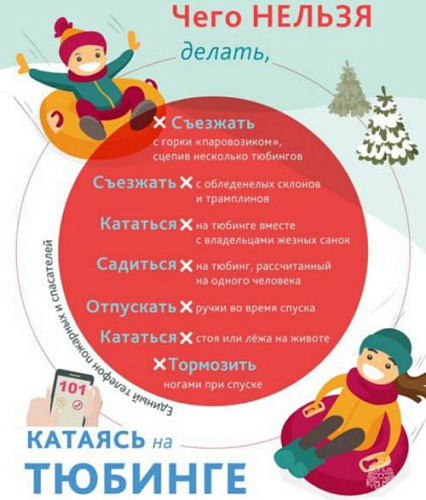 Не следует прикреплять «ватрушки» друг к другу «паровозиком» – они могут перевернуться. Не съезжайте с обледенелых склонов и трамплинов, не тормозите ногами при спуске и не отпускайте ремни, расположенные по бокам тюбинга. Кроме того, не следует кататься стоя или лёжа на животе и перегружать тюбы – в характеристиках каждой модели указан максимально допустимый для неё вес.