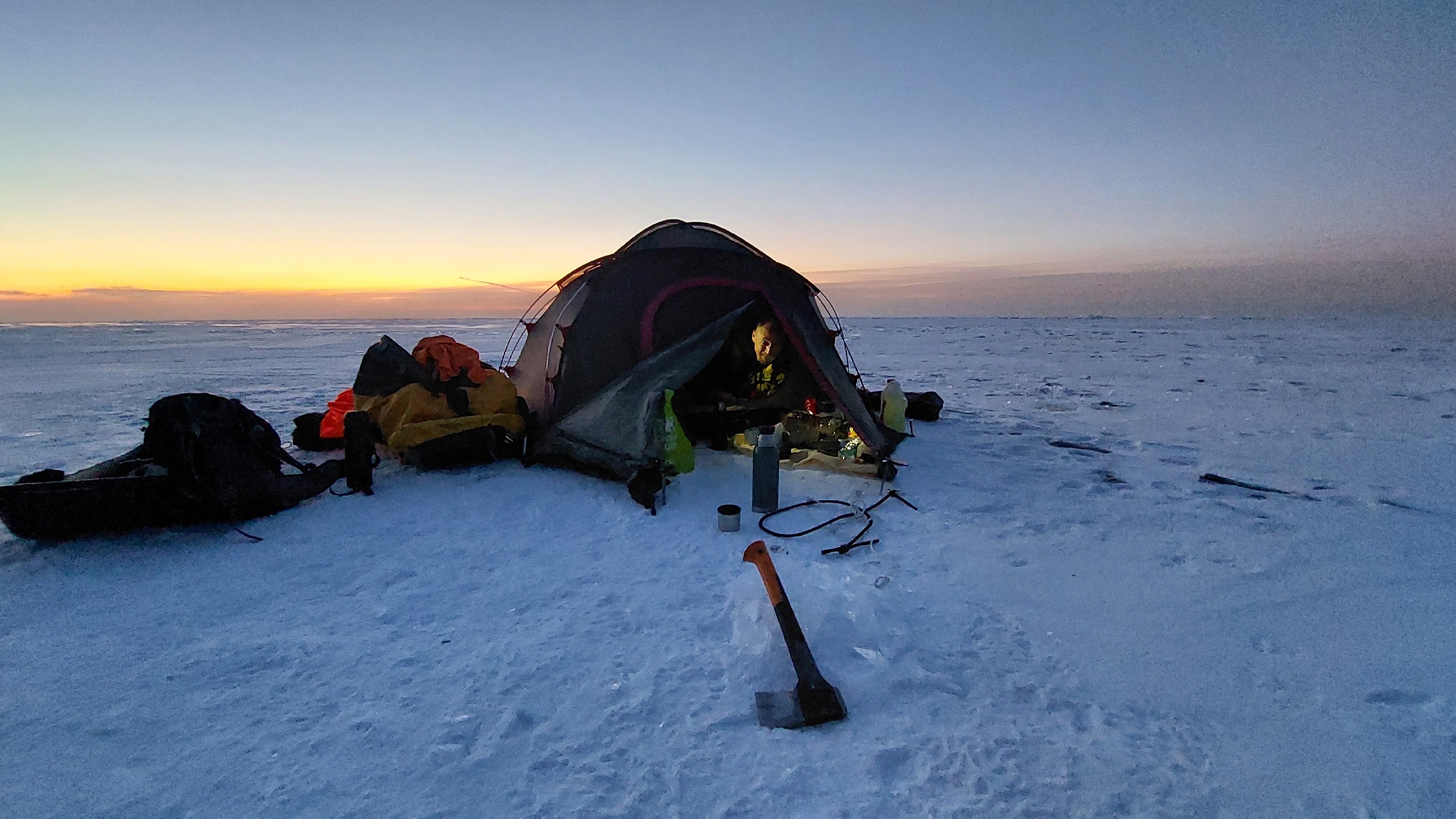 - Ночь была жаркая, спал прекрасно. Единственное, долбал лёд и ещё казалось, что ходят какие-то люди. Может, духи, а может, нам что-то пригрезилось, привиделось. Будто к палатке прямо подбежал. Я думаю, что это было связано с подвижками и ломкой льда, - рассказал Павел Каманин.