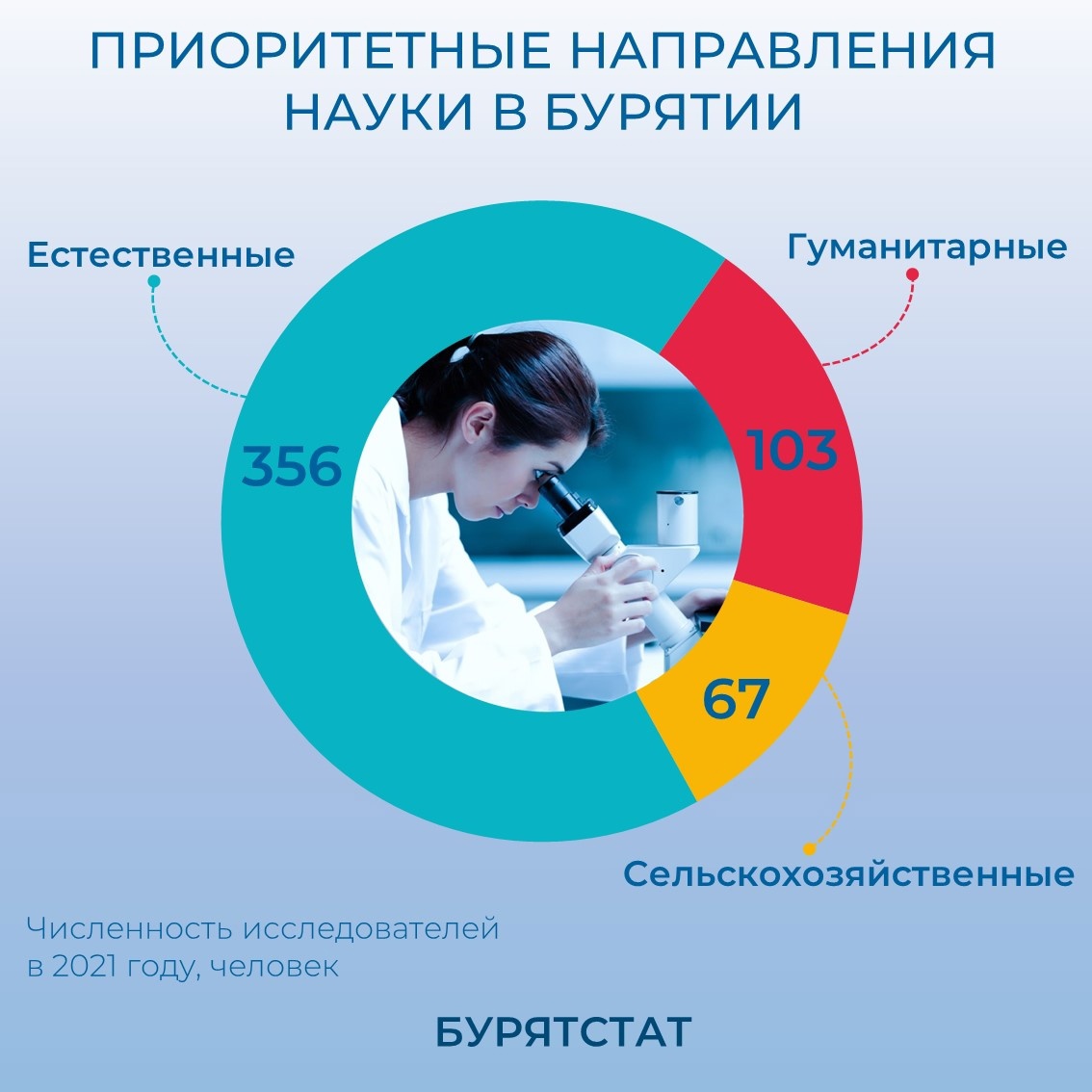 По данным на 2021 год, основная часть научных сотрудников РБ (61%) – это исследователи в области естественных наук. Далее идут представители гуманитарных (18%) и сельскохозяйственных (11%). За последние два года молодых учёных (в возрасте до 29 лет) в республике стало больше на 14,3%.
