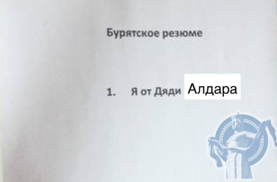 В соцсетях появился новый мем: бурятское резюме «Я от дяди Алдара». Его предложил «в свете последних событий» телеграм-канал Мать Бурятия по аналогии с популярным в последние годы выражением и текстом резюме «от дяди Баира». Многие думали, что оно было связано как раз с прежним руководителем администрации главы Бурятии.