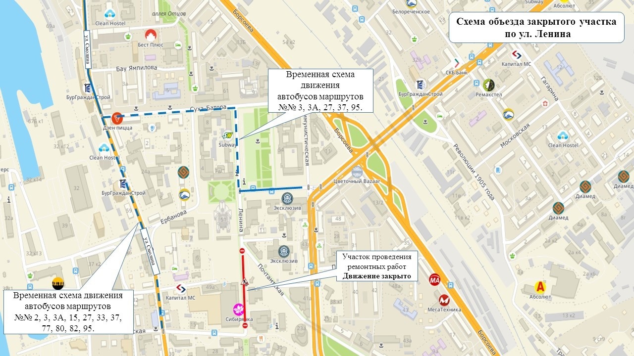 Из-за этого на две недели изменится схема движения сразу 12-ти маршруток – № 2, 3, 3А, 15, 27, 27 «Первое поле», 33, 37, 77, 80, 82 и 95. Они будут объезжать закрытый участок по улицам Сухэ-Батора и Смолина и далее – по утверждённой схеме.