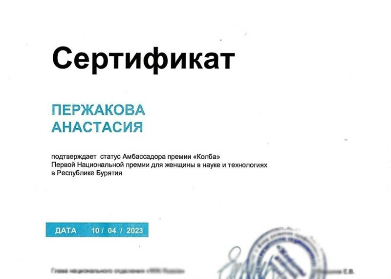 Анастасия Пержакова, учитель биологии школы №7 из Улан-Удэ, стала официальным амбассадором первой национальной премии «KOLBA» для женщин-учёных и специалистов из науки и технологий.