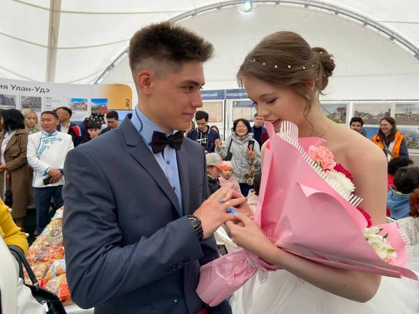 Пара поженилась на презентационной площадке Советского района Улан-Удэ. Площадка развёрнута в рамках выставки-презентации «Минии тоонто – Моя малая Родина» в честь 100-летия Республики Бурятия. Всего на площади Советов разместилось 20 презентационных юрт от муниципальных образований, а также два чума от Баунтовского и Северо-Байкальского районов.