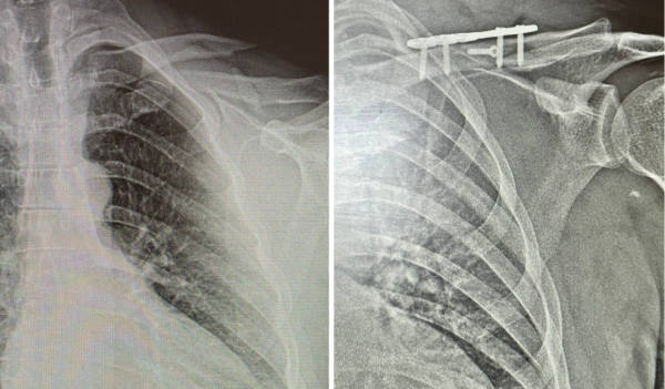 Мужчине тут же провели оперативное вмешательство для сопоставления частей переломанной ключицы при помощи пластины с угловой стабильностью и винтами. Прогноз благоприятный, отмечают врачи.