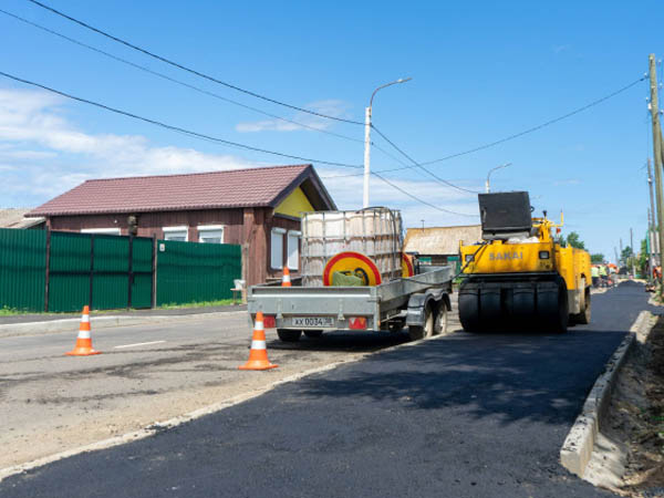 В Бурятии на участке с 41 по 51 км региональной дороги Тресково – Шергино – Оймур – Заречье подрядчик укладывает последние километры дорожного полотна, устраивает тротуары, остановки, барьерное ограждение.