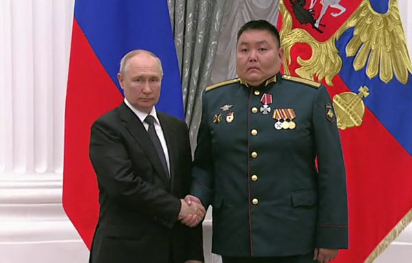 Военнослужащему 5-ой отдельной гвардейской танковой Тацинской Краснознамённой ордена Суворова бригады, старшине Валерию Хертухееву из Бурятии верховный главнокомандующий вручил орден Мужества. Президент повесил его нашему земляку на грудь.