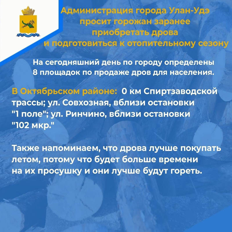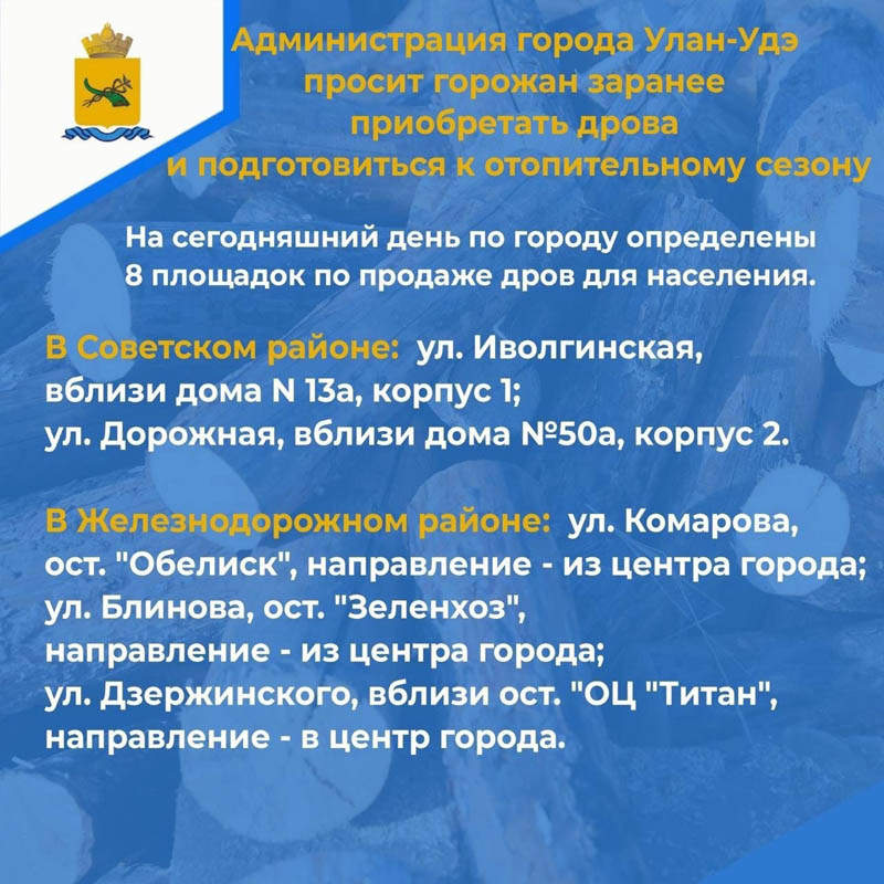 Администрация столицы Бурятии определила восемь площадок по продаже дров населению в городе Улан-Удэ. Они будут продаваться по следующим адресам: