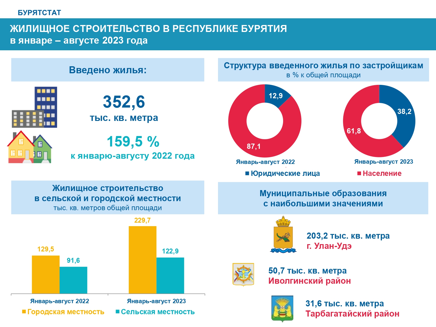 Основная доля (57,6%) введённого в республике жилья приходится на Улан-Удэ. Среди районов лидируют пригородные Иволгинский (14,4%) и Тарбагатайский (9%), а также Заиграевский (3,6%) и Кабанский (3%).