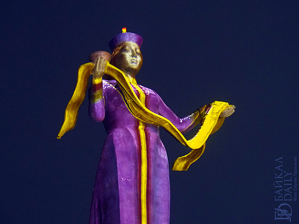 В Улан-Удэ скульптура «Мать Бурятия» сменила свой наряд. На этот раз с помощью света и проекции на неё «надели» национальный дэгэл рода сартуул. Произошло это вечером во вторник, 21 ноября.