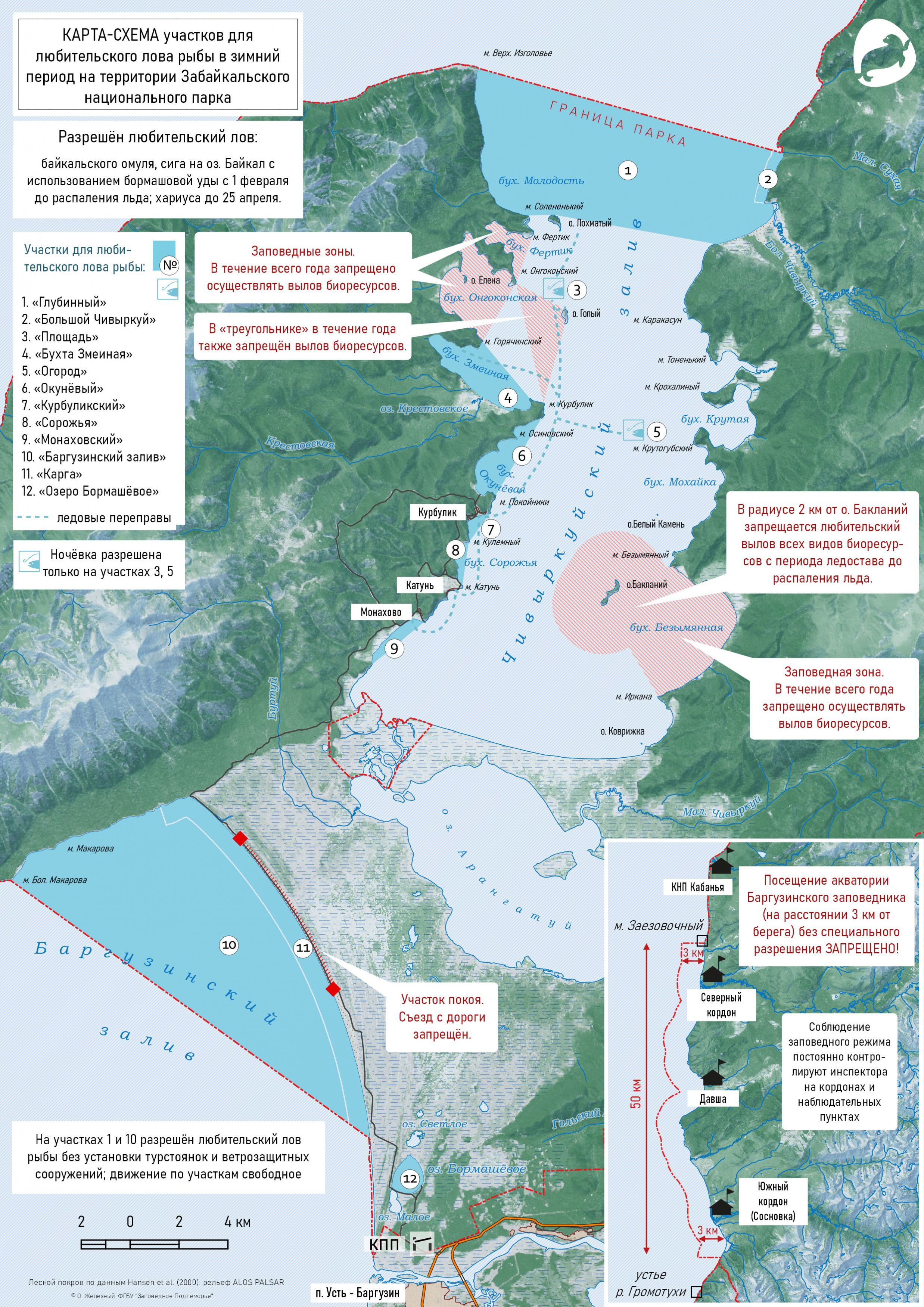 Движение по льду в рекреационных целях на автомототранспорте допускается только в пределах существующих маршрутов. Любительский и спортивный лов рыбы в зимний период, в том числе бормашовой удой, разрешается для всех посетителей на специально отведённых участках акватории Забайкальского национального парка:
