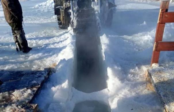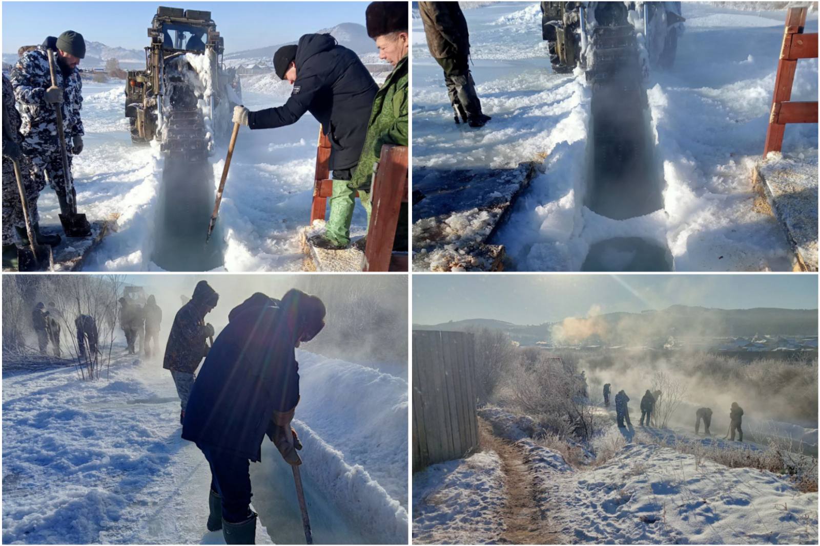 приступили к ледорезным работам. В районе улицы Строительная проделали траншею, чтобы предотвратить выход наледных вод.
