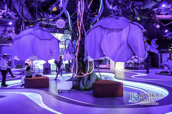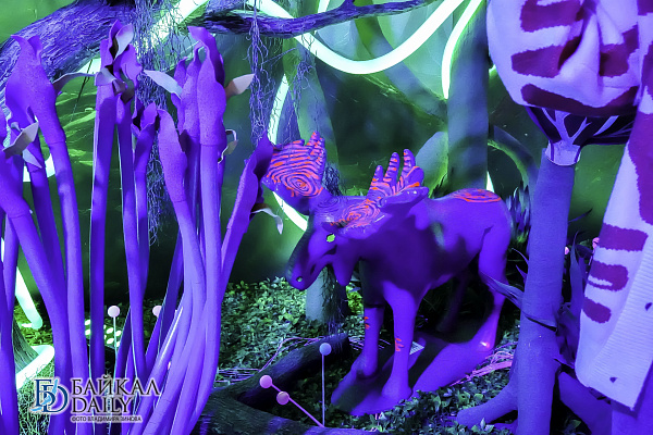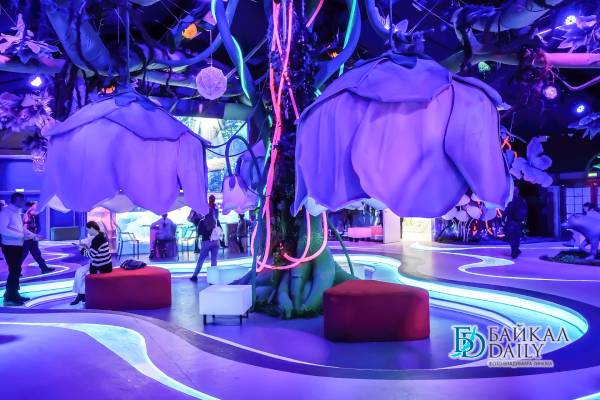 С порога выставка поражает своим видом – здесь «растут» неоновые деревья, огромные светящиеся грибы, в воде плавают голографические рыбы, а отдохнуть можно под бутоном огромного колокольчика. Ощущение, что попал в сказочный лес.