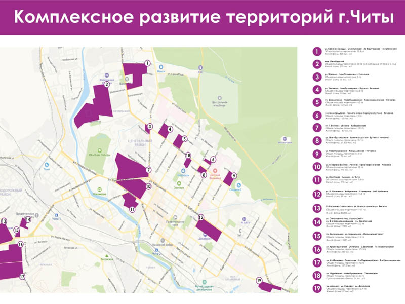 - На данный момент корпорация, выступающая региональным оператором по КРТ, отобрала 19 участков в Чите, в границах которых планируется комплексное развитие территорий. Общая площадь этих земельных участков составляет 172 гектара, где можно будет возвести около 1,9 миллиона квадратных метров нового жилья. Окончательная схема расположения участков будет подготовлена и опубликована после согласования с правительством Забайкальского края и городской администрацией к маю текущего года. После чего предполагается проведение конкурсных процедур по определению потенциальных застройщиков, – рассказал генеральный директор корпорации развития Забайкальского края Антон Тутов.