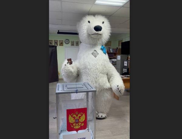 Так, в селе Орлик на избирательном участке №503 появился белый медведь. Большой мишка едва прошёл через рамку металлодетектора.