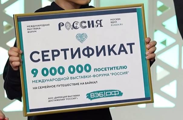 - У нас сегодня большое событие! Андрей, ты стал девятимиллионным посетителем. Наши большие друзья и партнёры ВЭБ. РФ дарят вашей дружной семье поездку на Байкал. Пусть это путешествие станет для тебя, твоих родителей и сестрёнки незабываемым приключением, которое навсегда останется в ваших сердцах. Мы за вас очень рады! — поздравила генеральный директор выставки «Россия» Наталья Виртуозова.