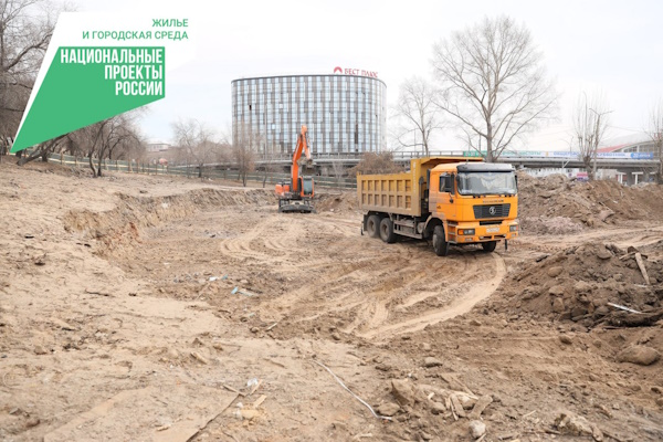 Подрядная организация начала рытье котлована для обустройства фундамента амфитеатра. Параллельно ведутся работы по сносу недостроенного здания, расположенного на этой территории.