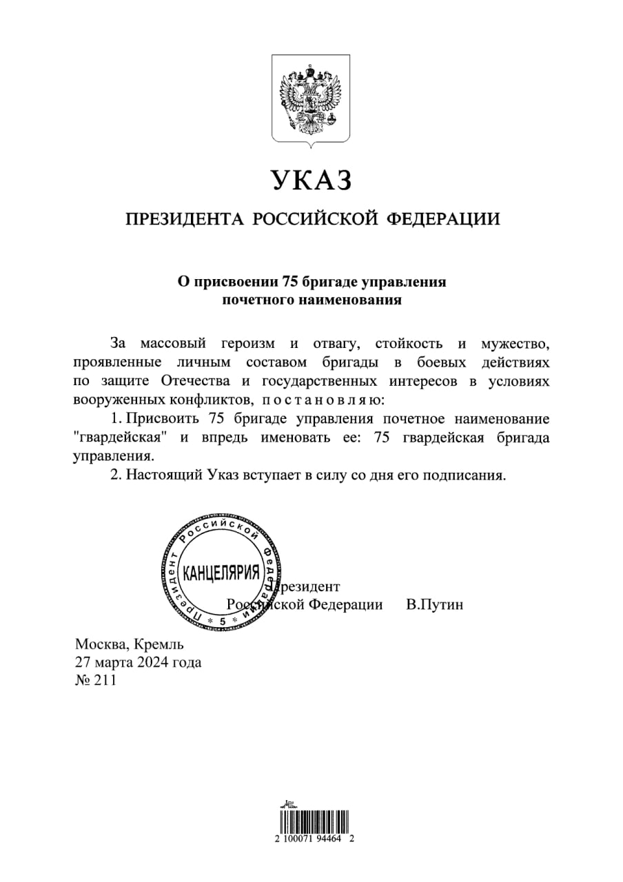 «За массовый героизм и отвагу, стойкость и мужество, проявленные личным составом бригады в боевых действиях по защите Отечества и государственных интересов в условиях вооруженных конфликтов постановляю: присвоить 75 бригаде управления почетное наименование «гвардейская» и впредь именовать ее 75 гвардейская бригада управления», - говорится в документе.