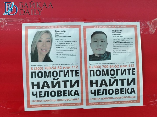 30-летняя жительница столицы Бурятии Сэсэг Буинова и её 26-летний знакомый Станислав Норбоев пропали при загадочных обстоятельствах более месяца назад. Они повстречались 11 апреля на парковке возле магазина крупной торговой сети на улице Бабушкина и, по данным следствия, вместе уехали в неизвестном направлении на автомобиле Mitsubishi Outlander. С тех пор об обоих ничего неизвестно.