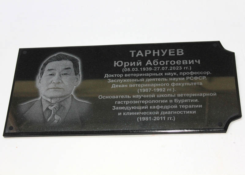 14 июня в Улан-Удэ, в клинике ветеринарной медицины Бурятской сельхозакадемии состоялось торжественное открытие мемориальной доски, посвящённой доктору ветеринарных наук, профессору, заслуженному деятелю науки Российской Федерации Юрию Абогоевичу Тарнуеву.
