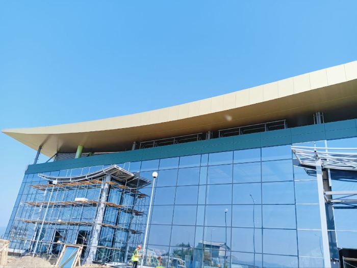 Двухэтажный аэровокзальный комплекс в буддийском стиле высотой в 17 метров и площадью в 6 629 «квадратов» возводят с западной стороны от нынешнего здания, предназначенного для внутренних авиарейсов, с весны 2023 года. С севера, на уровне второго этажа, к нему будут примыкать посадочные галереи, ведущие к двум телетрапам. Это позволит пассажирам попадать из терминала сразу на борт самолёта. Пока что людей подвозят на автобусах.