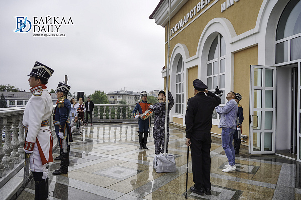 Флаг подняли капитан команды Технологического колледжа ВСГУТУ, победитель городской военно-патриотической игры «Патриот» Вадим Ведерников и участник специальной военной операции, лейтенант Алексей Мантушкин.