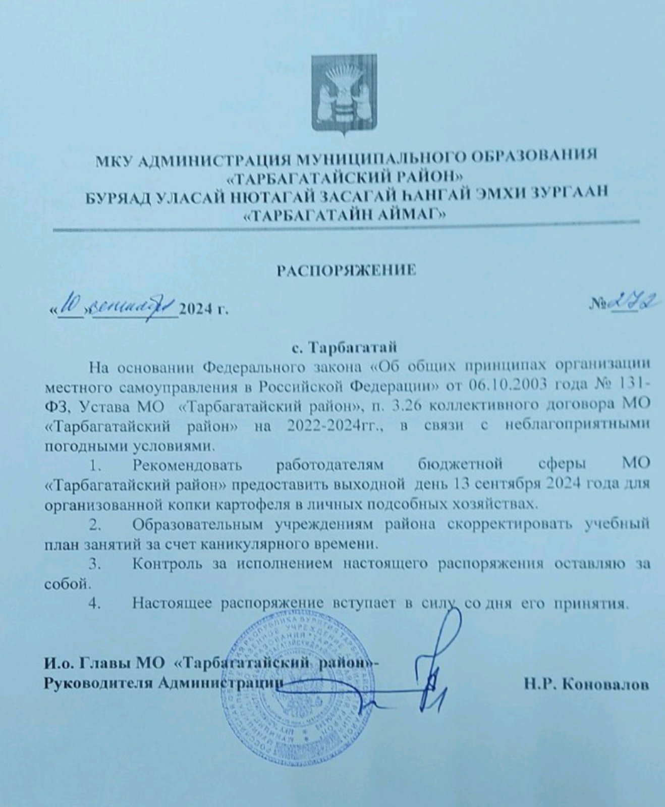 Распоряжение уже вступило в силу. Внеплановый выходной из-за картошки тарбагатайцам