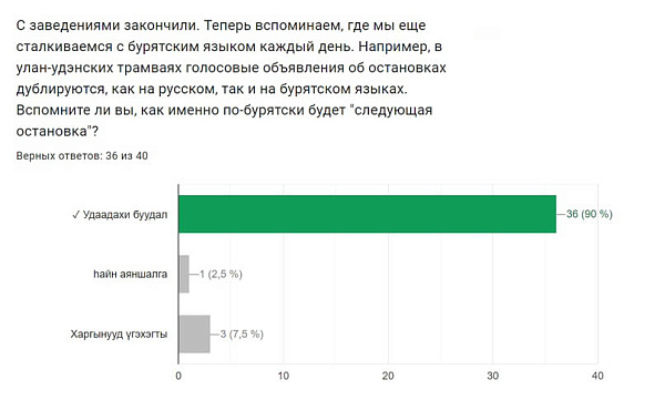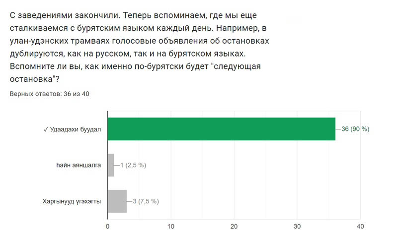 Слово «наран» знают 85 % респондентов — оно переводится как «солнце». Словосочетание «удаадахи буудал» могли слышать все, кто ездит в общественном транспорте города Улан-Удэ, так как голосовые объявления об остановках дублируются, как на русском, так и на бурятском языках. И 90 % правильно указали, что именно это и есть перевод словосочетания «следующая остановка».