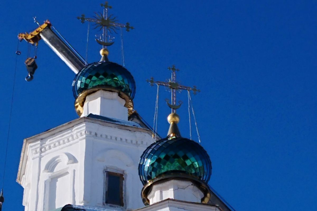 Кресты были в хорошем состоянии, их водрузили на новые купола. Также был изготовлен новый шпиль для колокольни, который установили на новый барабан. Старый крест, венчающий колокольню ранее, пришёл в негодность. Сейчас изготавливается новый крест.