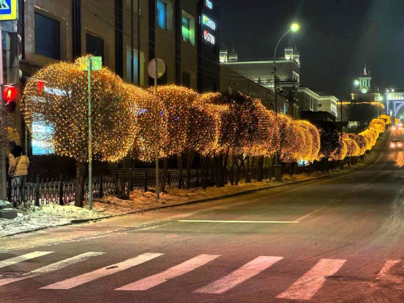 По новогодней традиции вечером 23 декабря в Улан-Удэ подключили световую иллюминацию на яблонях по улице Ленина. Об этом сообщил в соцсетях мэр столицы Бурятии Игорь Шутенков.