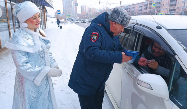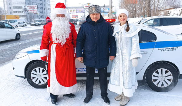 В рамках традиционной предновогодней акции «Полицейский Дед Мороз» в Бурятии начальник региональной Госавтоинспекции поздравил автомобилистов с наступающим праздником. Поздравления прозвучали не только от руководства ГИБДД, но и от новогодних персонажей – Деда Мороза и Снегурочки.