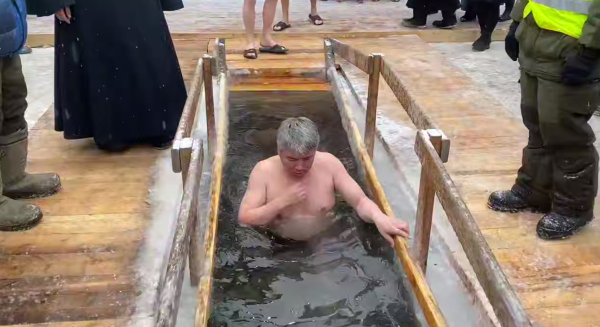 На кадрах, облетевших соцсети, видно, что Алексей Цыденов зашёл в воду, перекрестился и после трижды окунулся в иордань с головой. Стоявшие рядом жители республики поздравили его с праздником.