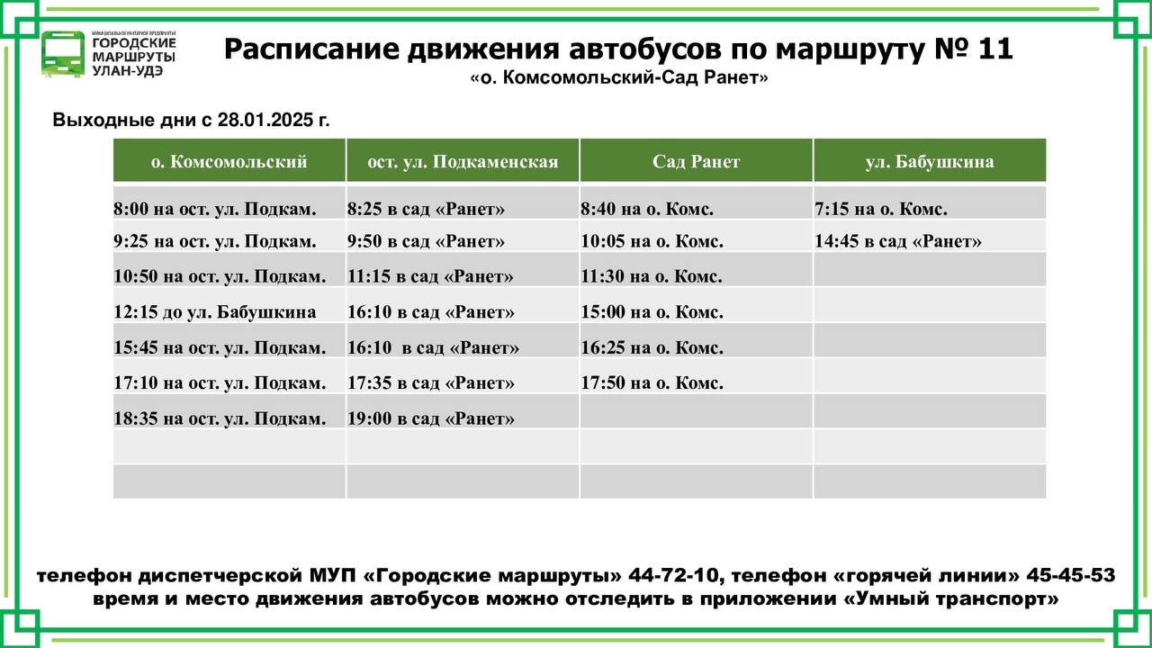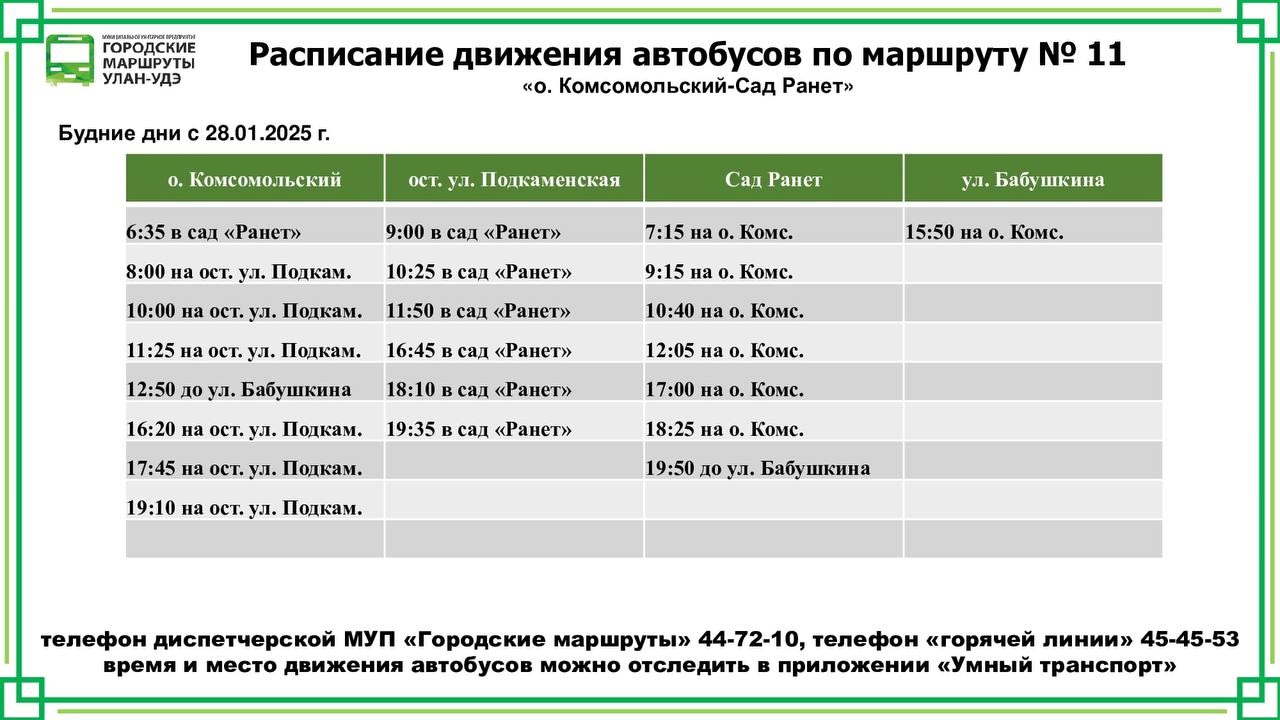 В Улан-Удэ с 28 января на маршрутах №№ 11, 21А и 51 будет действовать новое расписание. Изменения связаны с мерами по улучшению транспортного обслуживания населения, сообщает администрация Железнодорожного района.