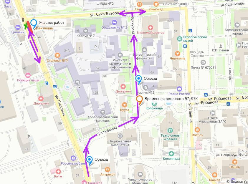 Речь, в частности, о маршрутках № 97 и 97К, которые идут на площадь Советов. Временную остановку для них определили на Ранжурова, около БГУ. Пешеходный переход у пересечения с Сухэ-Батора закрыли. Работы по замене ветхих сетей водоснабжения на этом участке продлятся ориентировочно до конца марта.