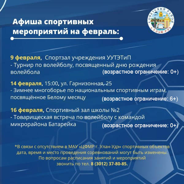 В столице Бурятии стали известны спортивные события февраля в Советском районе. Об этом сообщает районная администрация.