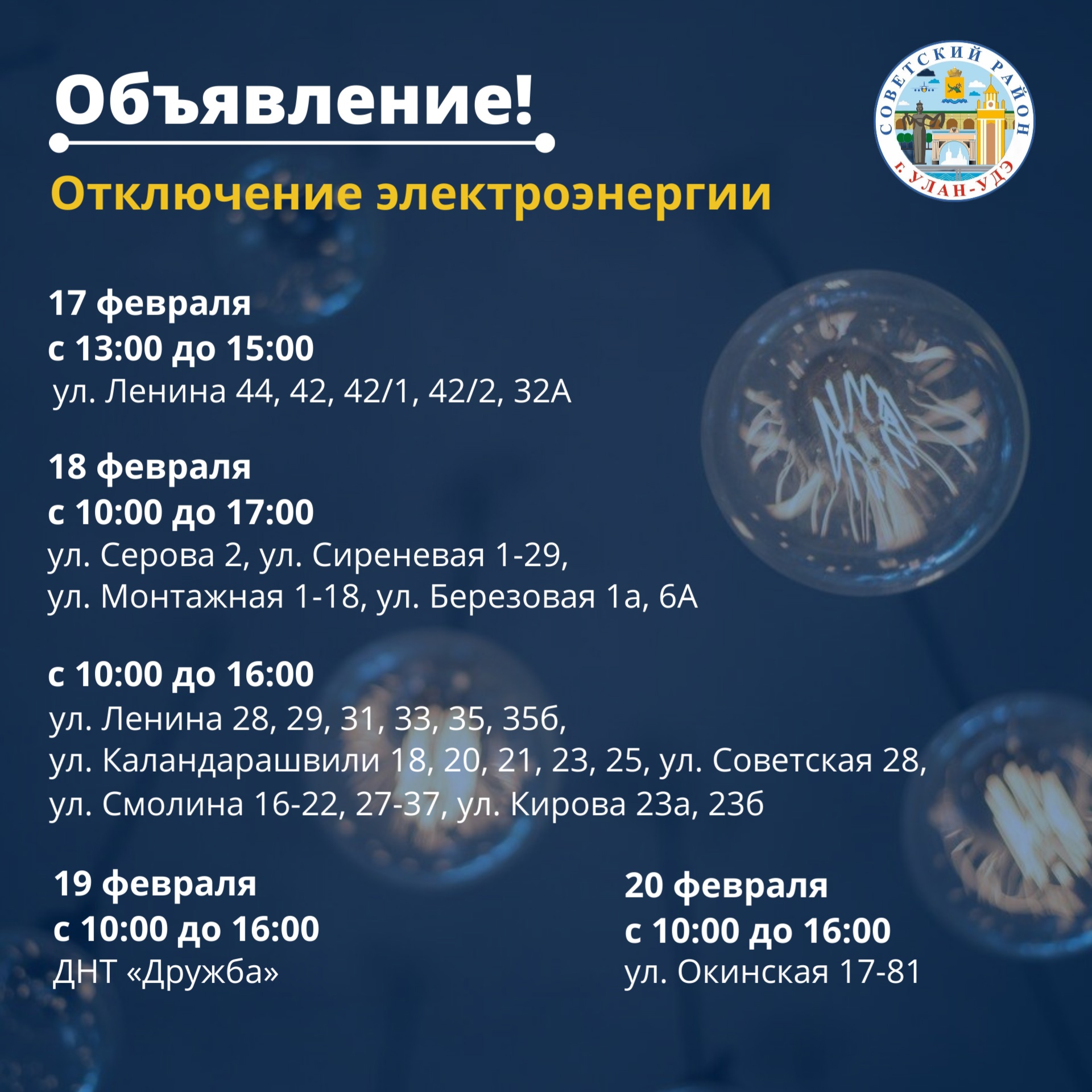 Как сообщили в районной администрации, света не будет с 17 по 20 февраля по адресам: