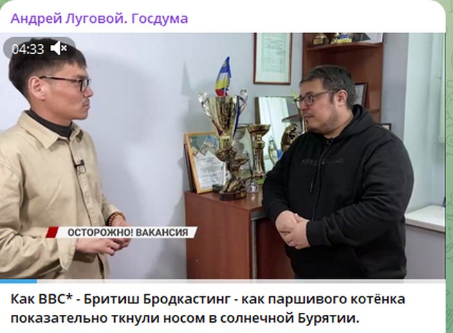 Андрей Луговой, бывший сотрудник российских спецслужб, а ныне депутат Государственной думы и телеведущий, в своём телеграм-канале 18 февраля опубликовал пост под показательным названием: «Как ВВС* - Бритиш Бродкастинг - как паршивого котёнка показательно ткнули носом в солнечной Бурятии».