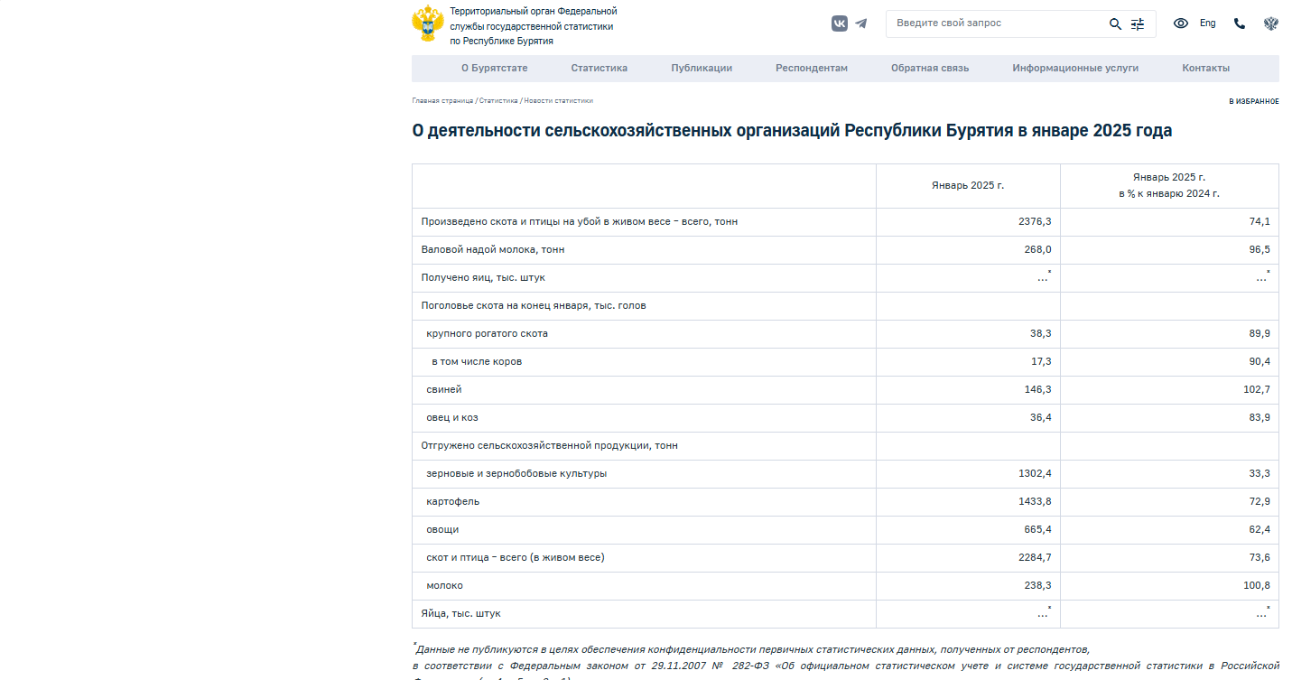 Напротив строки «яйца» на официальном сайте Бурятстата стоит многоточие, а в сноске говорится, что информация «не публикуется в целях обеспечения конфиденциальности первичных статистических данных, полученных от респондентов».