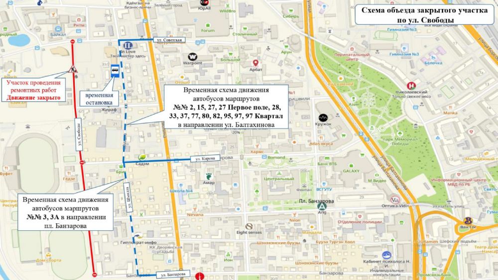 В связи с реконструкцией инженерных сетей в Советском районе с 17 марта и ориентировочно до середины сентября будет закрыт для движения транспорта участок дороги по улице Свободы от улицы Советской до улицы Банзарова. Об этом сообщает комитет мэрии Улан-Удэ по транспорту.
