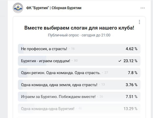 Футбольный клуб «Бурятия», выступающий в «Третьей лиге», чемпионате Сибири и Дальнего Востока среди любительских команд, запустил на своей странице во «Вконтакте» голосование по возможному слогану команды.