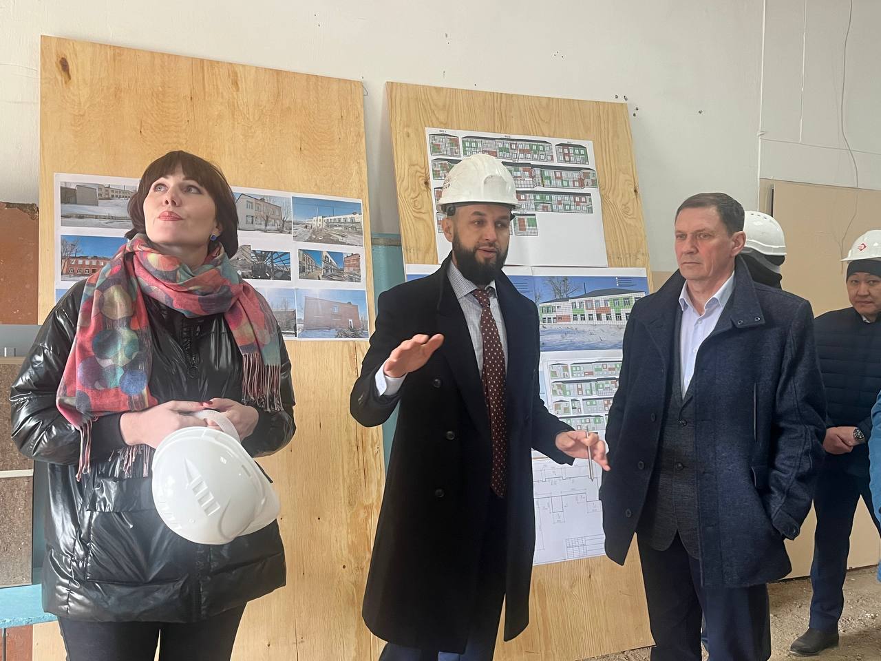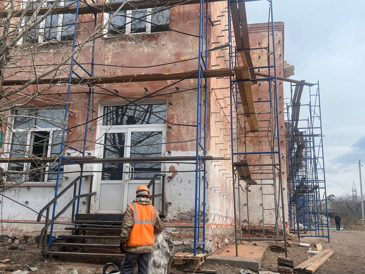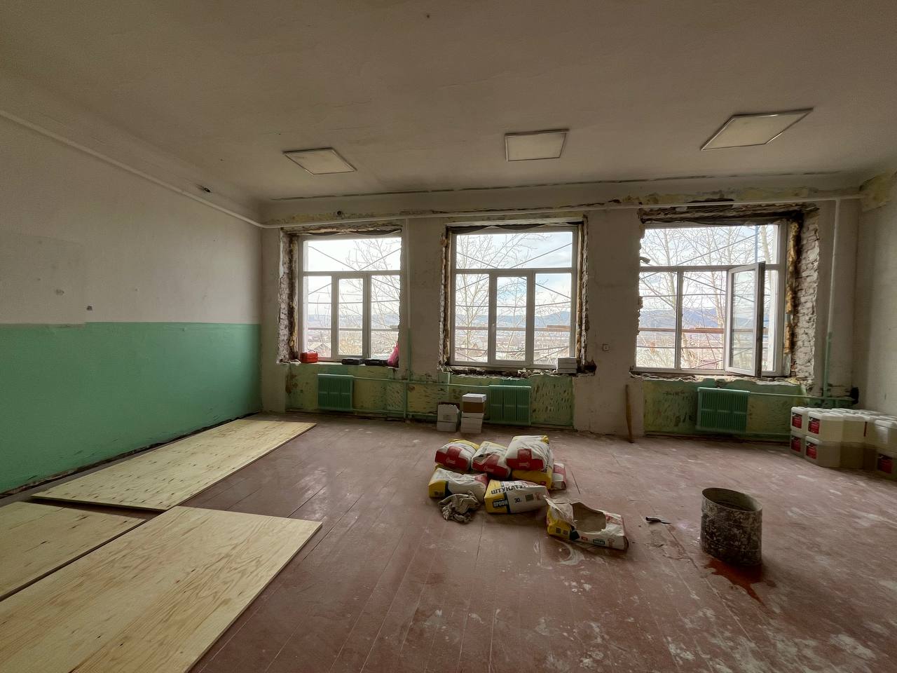 Работы стартовали 13 марта. Здесь строители демонтировали старый фасад, кровлю, полы, дверные коробки и сгнившие перегородки. Приступили к штукатурным работам в классах и монтажу кронштейнов по вентилируемому фасаду.