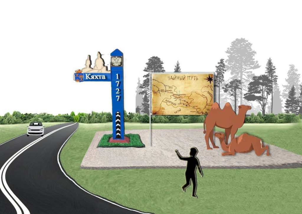Проект не просто стела, а сочетание удачных архитектурных решений. Выполненный в форме пограничного столба объект подчёркивает особое географическое положение Кяхты. Светодиодная подсветка с изображением герба города и названием «Кяхта» сделает стелу заметной издалека даже ночью. Кроме того, проект включает в себя зону отдыха со стендом, на котором изображена карта границ России с указанием Кяхты как столицы Великого чайного пути, а также стилизованное изображение верблюдов – напоминание о торговых караванах, перевозивших тысячи тонн чая из Китая в Кяхту в XVIII-XIX веках.