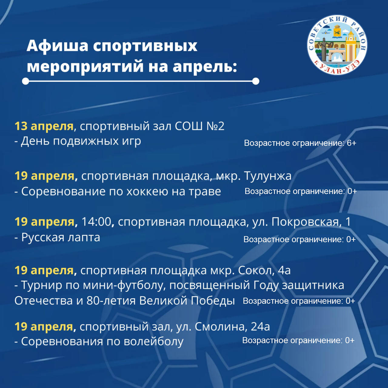 В Улан-Удэ стали известны спортивные события, которые пройдут в апреле в Советском районе. Их проведёт городской центр физкультурно-массовой работы.
