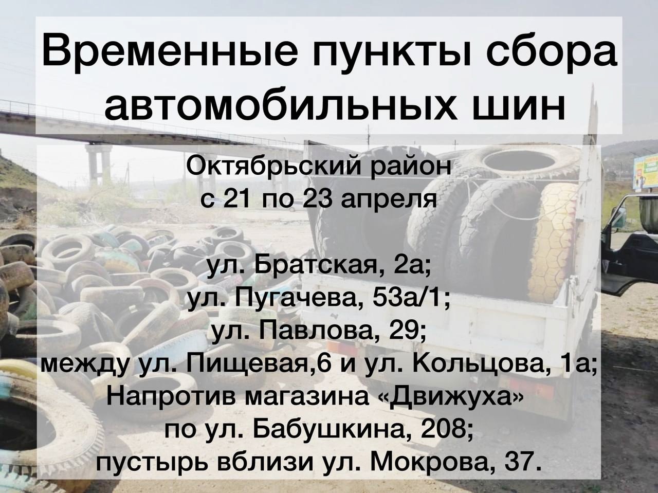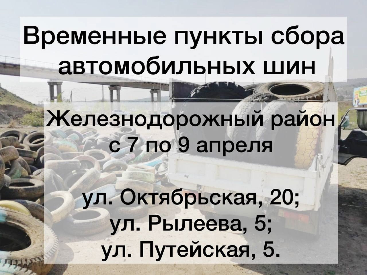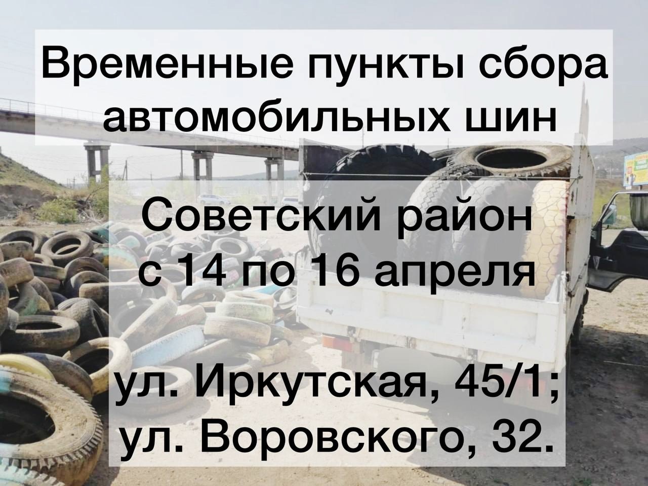В Улан-Удэ в дни весеннего месячника чистоты пройдёт ежегодная акция «Город без покрышек». В городе определены временные места для сбора автомобильных покрышек, которые в дальнейшем станут сырьём для производства безопасного и долговечного резинового покрытия и плитки.