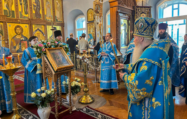 Как сообщили в епархии, в канун праздника на средине храма была установлена уникальная святыня — древняя икона Благовещения Пресвятой Богородицы, которой уже более 500 лет. Этот образ — дар митрополиту Иосифу одного из благотворителей. Икона написана в первой трети XVI века, при великом князе Василии III и, по мнению искусствоведов, происходит из ростово-суздальских земель, либо, возможно, из северных провинций Новгорода, испытавших воздействие ростовской культуры. Древний образ сохранился до наших дней в целом в хорошем состоянии. Перед этой святыней, празднично украшенной цветами, и совершались торжественные богослужения в праздник Благовещения.