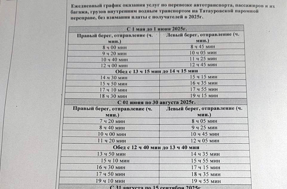 С 16 сентября по 31 октября перевозка автотранспорта будет осуществляться по 6 раз с каждого берега с 8:00 до 17:10, обед: с 12:00 до 13:00. Расписание может корректироваться из-за погодных условий.