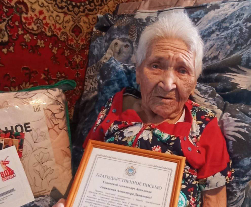 - Земляки доверяли ей, неоднократно избиралась депутатом местного совета. Наша землячка и долгожитель имеет грамоты района, благодарности райкома партии, исполкома Хоринского района. Александра Даниловна рано овдовела, воспитала дочь и сына. Сейчас окружена любовью внуков и правнуков, - рассказала начальник районного отдела соцзащиты Дарима Будаева. - С благодарностью сегодня юбиляра поздравили семья и земляки, мы вручили персональные поздравления от президента России В. В. Путина и главы Бурятии А. С. Цыденова с юбилеем и 80-летием Победы, сертификат на единовременную выплату.