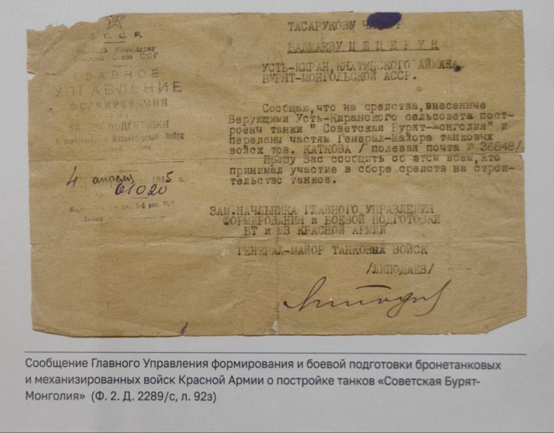 Также из переданных документов стало известно, что на средства, внесённые жителями Усть-Кирана, построены танки «Советская Бурят-Монголия». Машины были переданы генерал-майору танковых войск тов. (Фёдору – прим) Каткову.