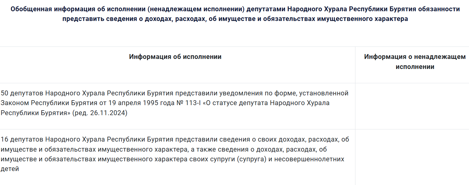 На официальном сайте Народного Хурала в этот раз, к примеру, разместили только данные о том, подали ли народные избранники декларации за истёкшие 12 месяцев. Так вот, 16 законотворцев представили данные о доходах, расходах, об имуществе и обязательствах имущественного характера – как собственных, так и своих супругов и несовершеннолетних детей. Ещё 50 предъявили уведомления по форме, установленной республиканским законом № 113-I «О статусе депутата Народного Хурала».