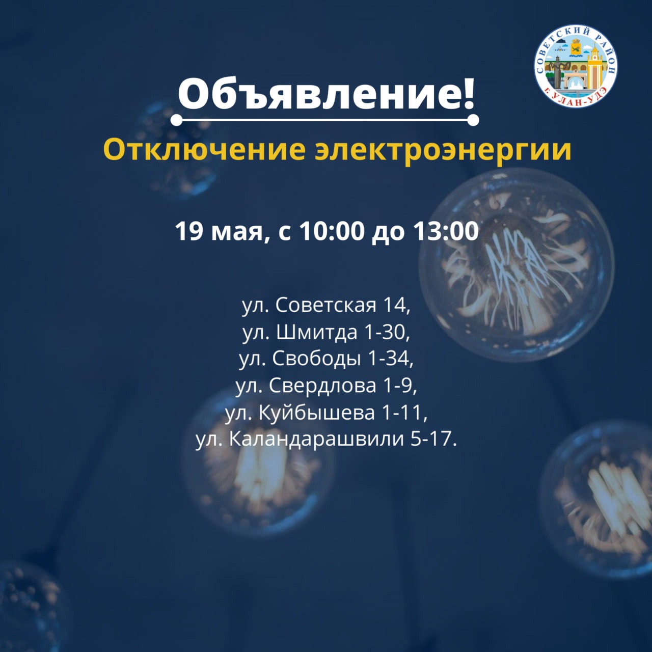 19 мая в столице Бурятии с 10:00 до 17:00 в связи с производством плановых работ будет отключена электроэнергия потребителям по адресам: