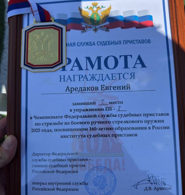 Евгений Аредаков - мастер спорта России по служебному биатлону, кандидат в мастера спорта по стрельбе из боевого ручного стрелкового оружия, многократный призёр и победитель чемпионатов ФССП России по служебному биатлону, служебному двоеборью и стрельбе из боевого ручного стрелкового оружия.